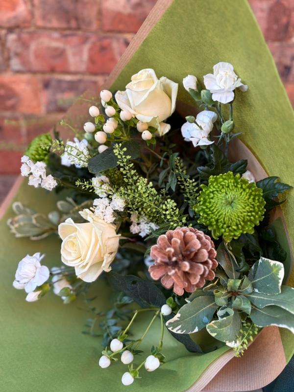A traditional wrap of seasonal flowers, finished in brown paper.